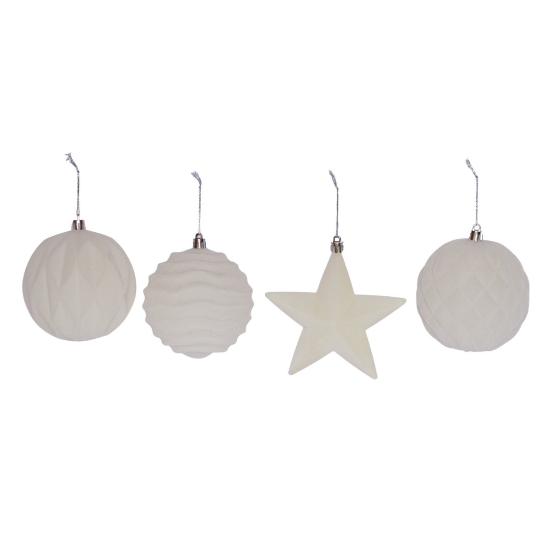 Cada pieza está cuidadosamente elaborada y recubierta en terciopelo de tacto suave. El set incluye 6 esferas (presentadas en tres labrados diferentes) y 3 estrellas en el mismo acabado, todos con casquillo dorado y colgador listo para usar. Vienen en caja con compartimentos protectores, perfectos para conservarlos entre temporadas.