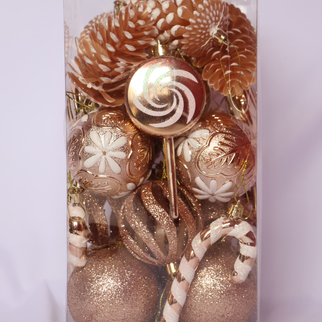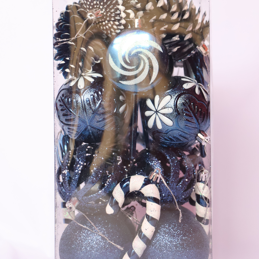 Dale a tu árbol un toque lleno de color con el Kit Candy: 27 piezas ideales para decorar árbol, guirnaldas, coronas y centros de mesa. Este set inspirado en dulces incluye esferas, bastones de caramelo y figuras tipo paleta —acabados con brillo y texturas que resaltan con las luces navideñas.