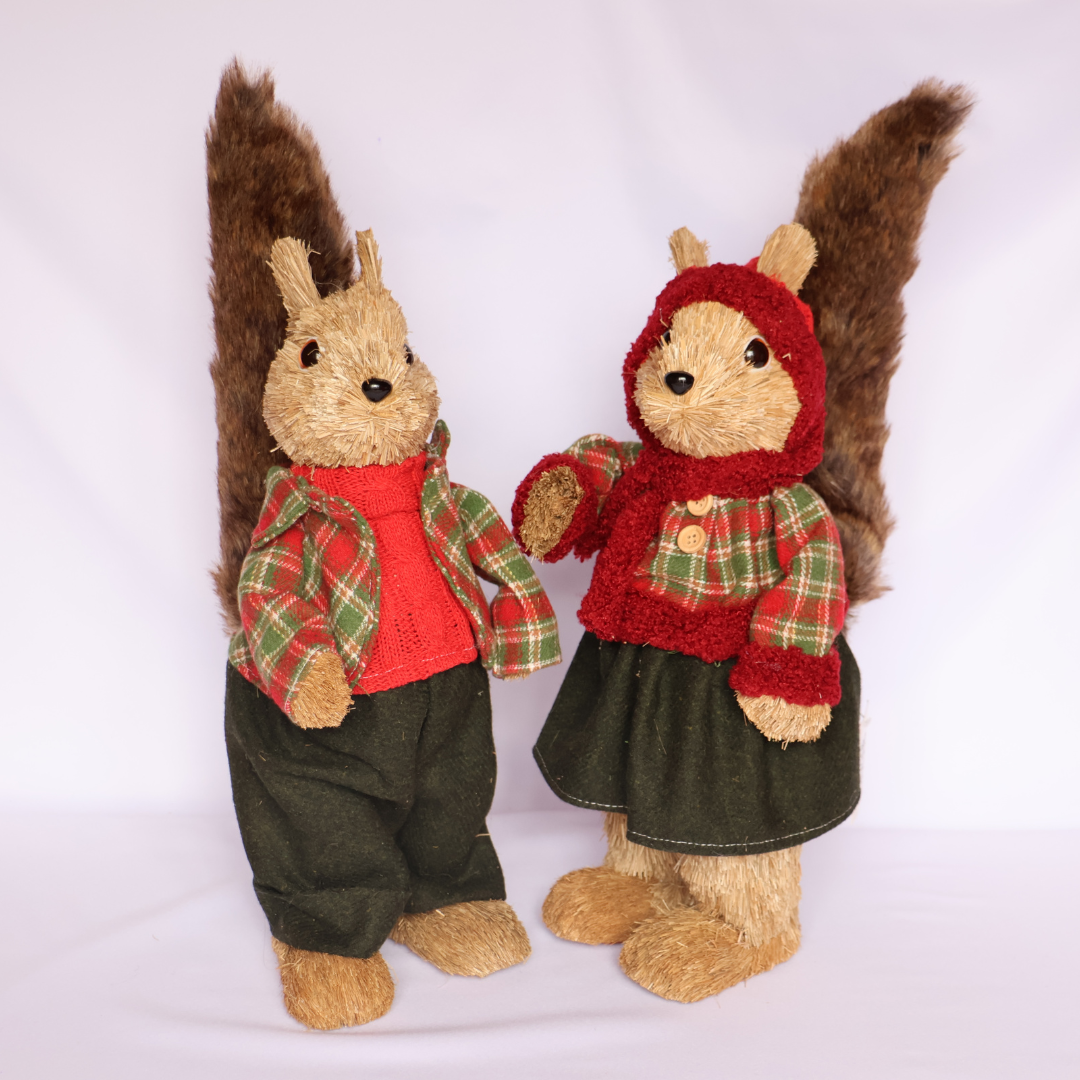 Cada figura está cuidadosamente elaborada en fibra de coco. Las ardillas visten prendas en tejido y fieltro —jerseys y camisas con motivos navideños. Sus colas presentan un acabado de pelo sintético que aporta volumen y un contraste táctil elegante.