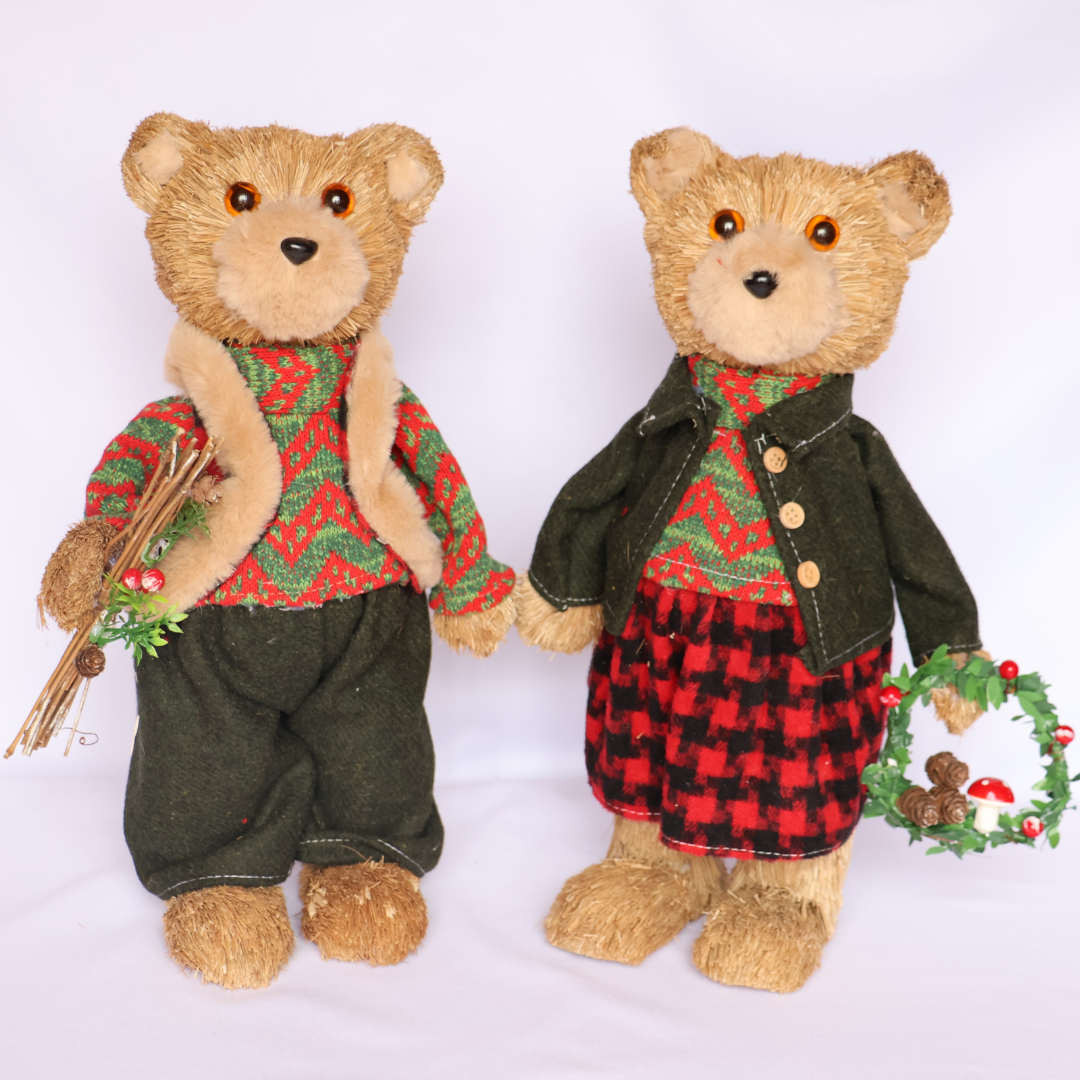 Cada figura está cuidadosamente elaborada en fibra natural (tipo coco). Los osos visten prendas en tejido y fieltro (suéteres con motivos navideños, chaleco y falda).