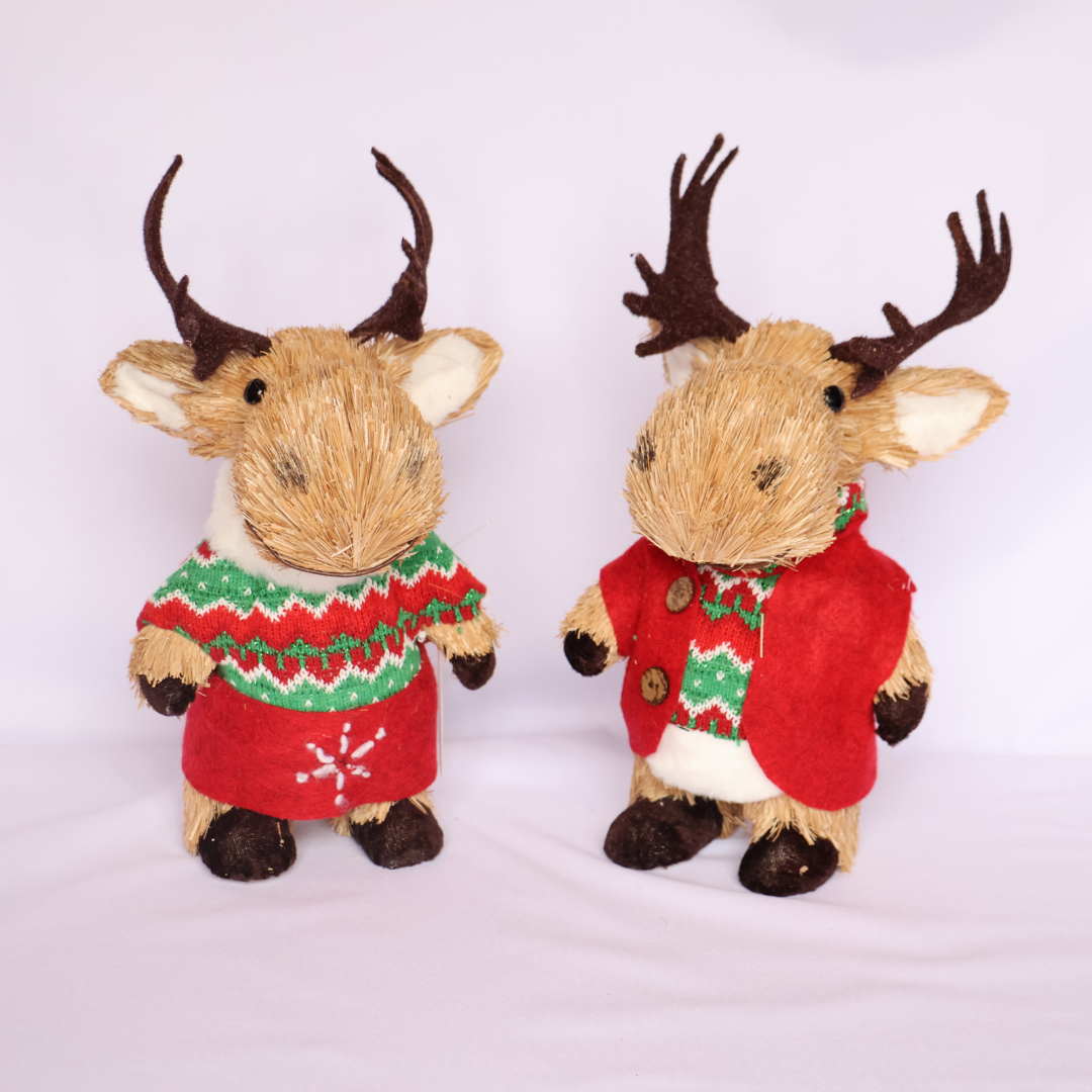 Cada figura está cuidadosamente elaborada en fibra natural (tipo coco) que le aporta ese aspecto rústico y artesanal tan característico. Los renos visten detalles en fieltro y tejido (suéteres y chalecos con motivos navideños).