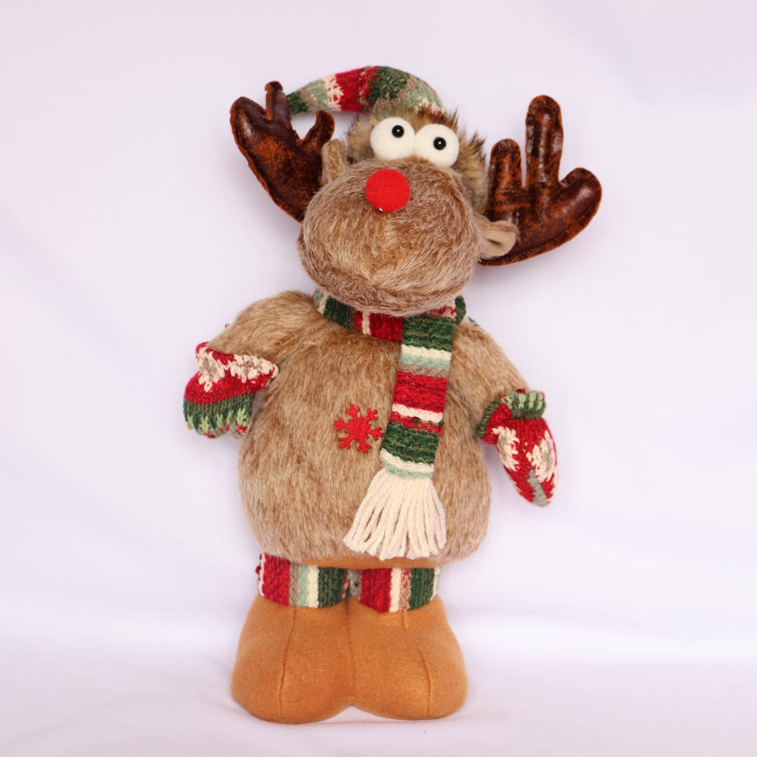 Cada figura está cuidadosamente elaborada con acabados de pelaje sintético suave y detalles textiles que le dan carácter y ternura. Vestido con gorro, bufanda y manoplas tejidas, botas en tejido tipo fieltro y astas en material aterciopelado.