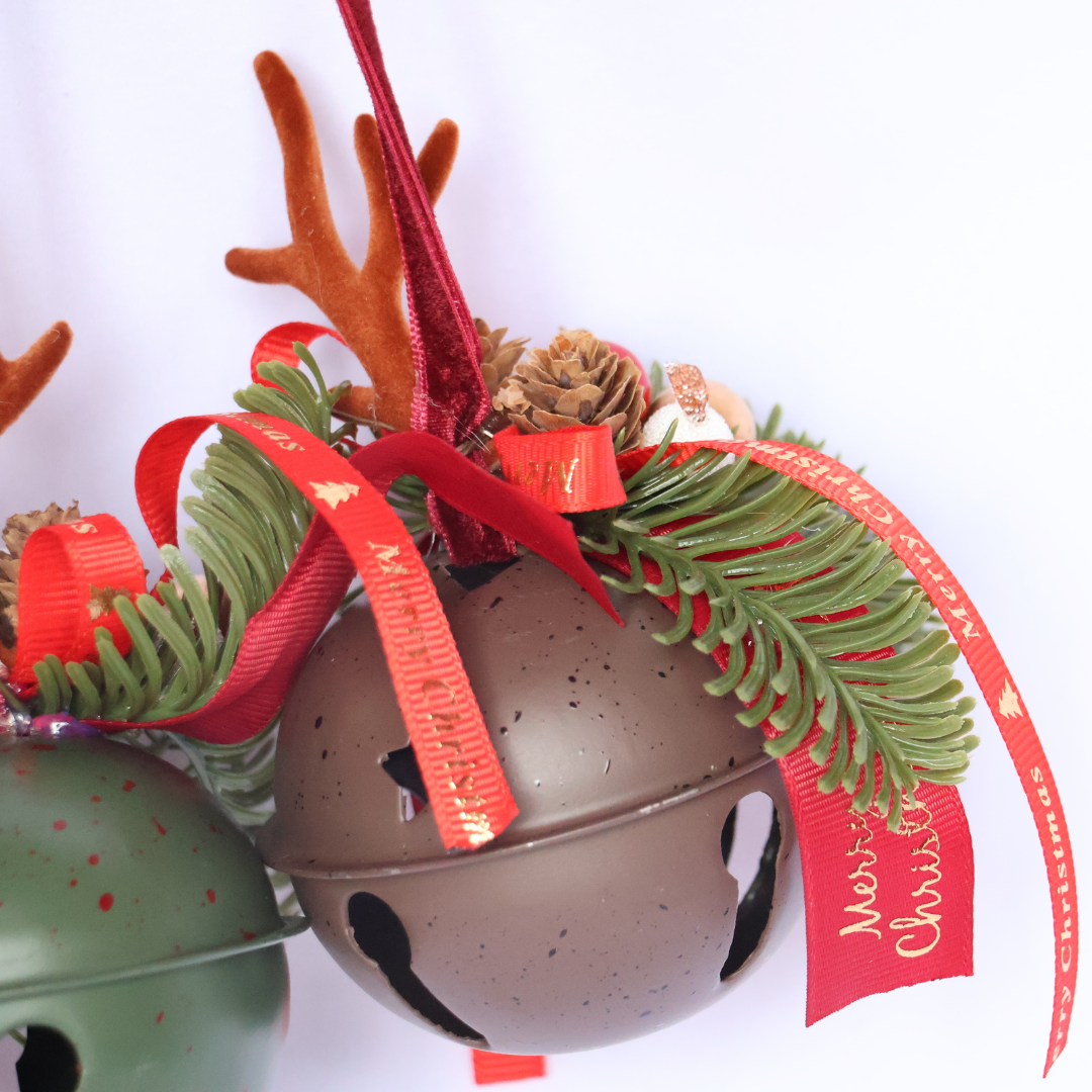 Cada pieza está cuidadosamente elaborada en metal. Decoradas con ramitas de pino, piñas, cintas de terciopelo y cuernos de reno en fieltro, estas campanas capturan la esencia más tierna y mágica de la Navidad.